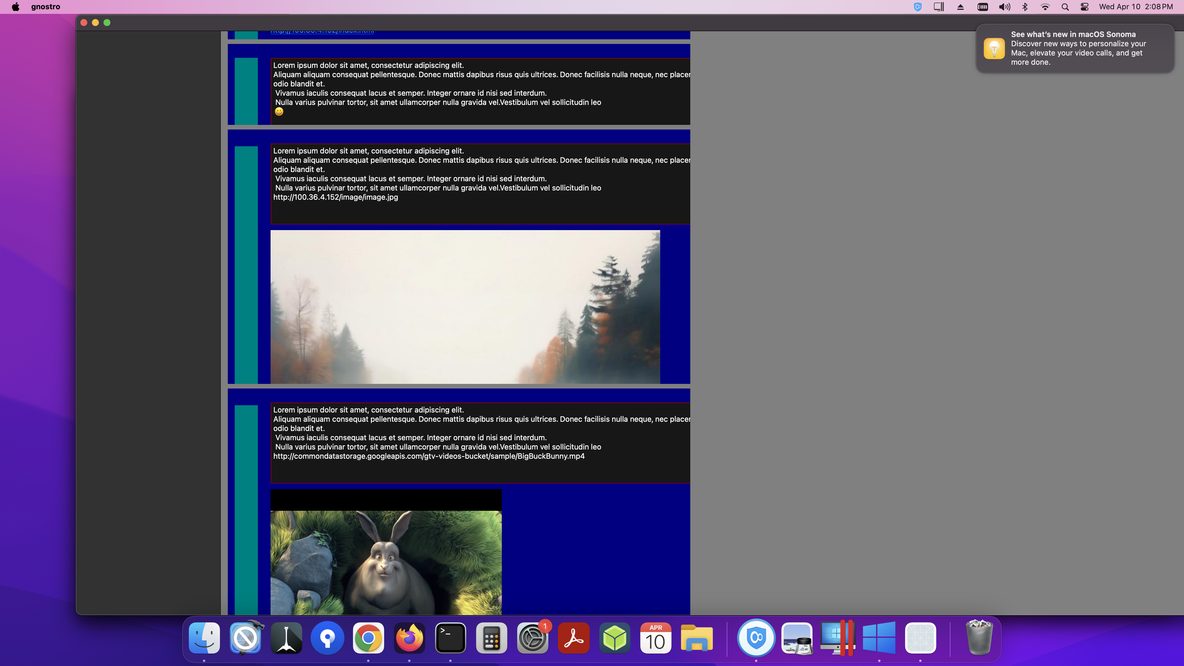 Nostro is a Nostr desktop native client, available for Mac OS, Linux, and Windows. It is currently in development. This screenshot shows it running on Mac OS, displaying several types of multimedia networked content.