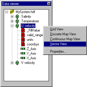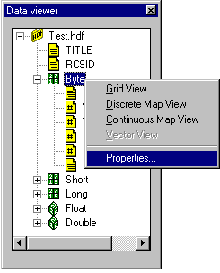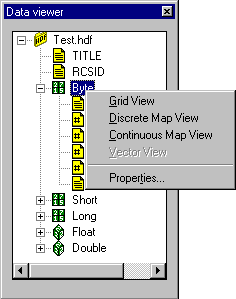 To visualize your data click with the mouse right-button on the selected tree item. A menu will appear that lists the kind of views available for that HDF data type. The HDF data format can store images, text, and numeric arrays. HdfExplorer shows each data object accordingly. There are mainly two types of views in HdfExplorer: a grid view, where the numbers are displayed in a rectangular grid of values, and image views, where the numbers are translated into a map of colors. For the SDS data object a third kind of view is available, the vector view.