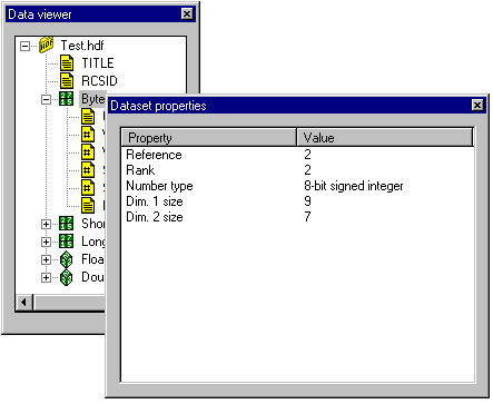 The properties window shows some features of the HDF object, like its reference number, its number type or its dimensions. Addicional information on these properties can be found on the NCSA HDF userīs guide.