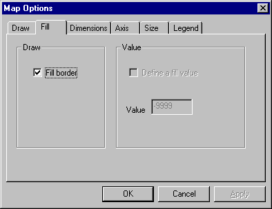 In the Fill options dialog box the user can choose to ignore or not a SDS fill value. If a SDS contains a fill value, by default HdfExplorer ignores this value in the making of the map, that is, the fill value is not translated to a color. The user also has an option to draw the fill value border in the grid.