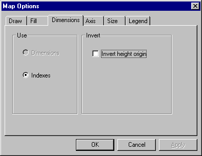 In the Dimensions options dialog box the user can choose to visualize or not the SDS dimensions in the map. It is also possible to invert the heigth scale. By default the height origin is placed in the bottom left corner of the map.