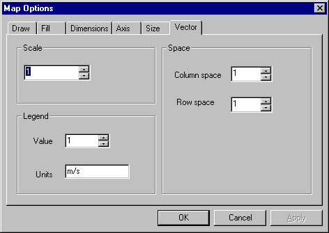 The vector options dialog box lets you choose the scale of the vectors, to define a value for the legend, and to choose the space between grid cells that each vector is drawn.