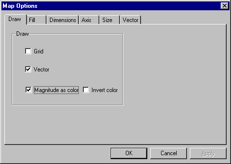 The Draw options of the vector view are similar to the scalar view. The user can choose to draw some basic features of the map. These are the arrow representing the vector, the rectangular grid, and the magnitude of each vector as a color. It is also possible to invert this palette.